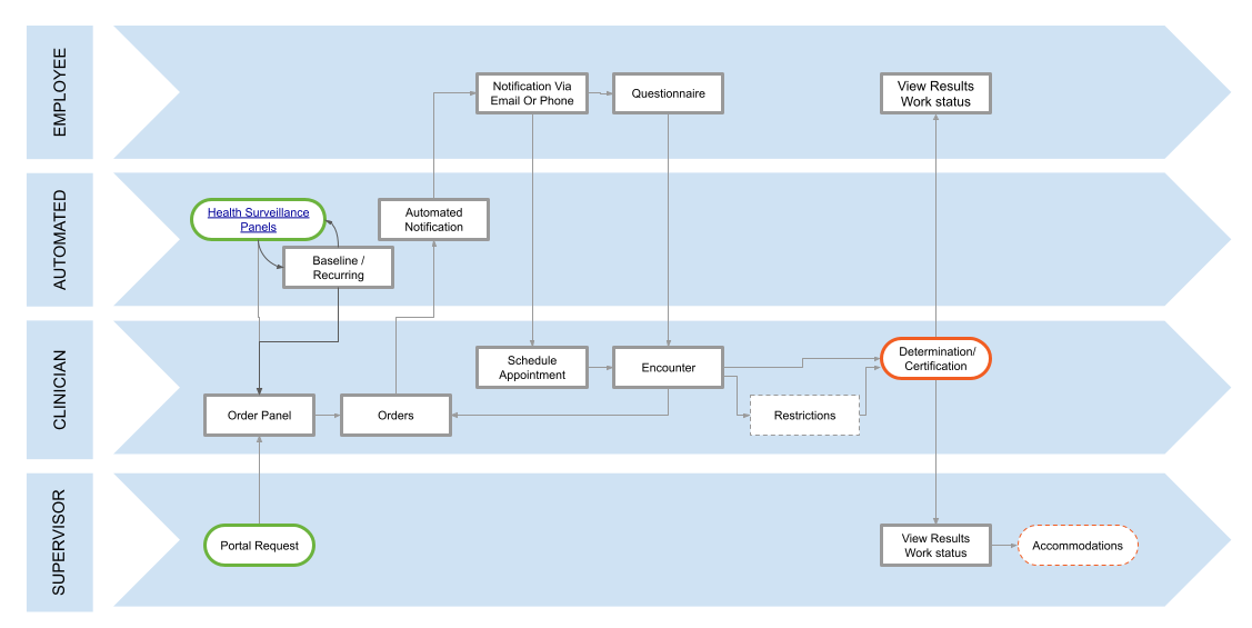 To assist in the recordkeeping requirements for occupational health surveillance, the  Enterprise Health  system provides many time-saving features and functionalities. With regular medical surveillance, the necessary documentation and compliance reporting can easily be generated and automated through data overlay technology on necessary forms, as well as through encounter protocols and configured print definitions.