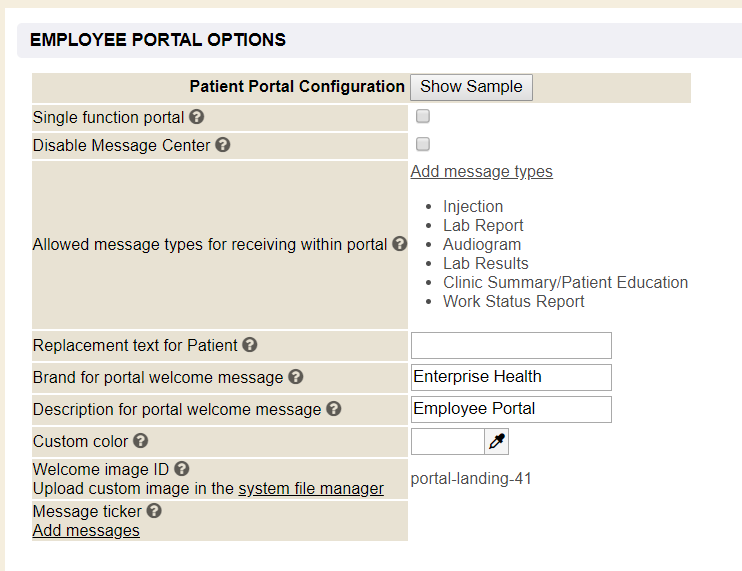 In order to access the portal as an employee, users must be established in the Enterprise Health system and have the appropriate role affiliation (i.e., an established Self role and No More Clipboard User role). To customize and configure each portal individually, users may navigate to the respective tab of the Provider Organization. For instance, the Patient Portal tab contains configuration options for the employee portal, exclusively. Under this tab, there is an Employee Portal Options section, which addresses things such as the ability to disable the message center or configure document types needed for display in the portal, or the ability to add or modify replacement text, labels, tab colors, the landing page image, or even the message ticker.