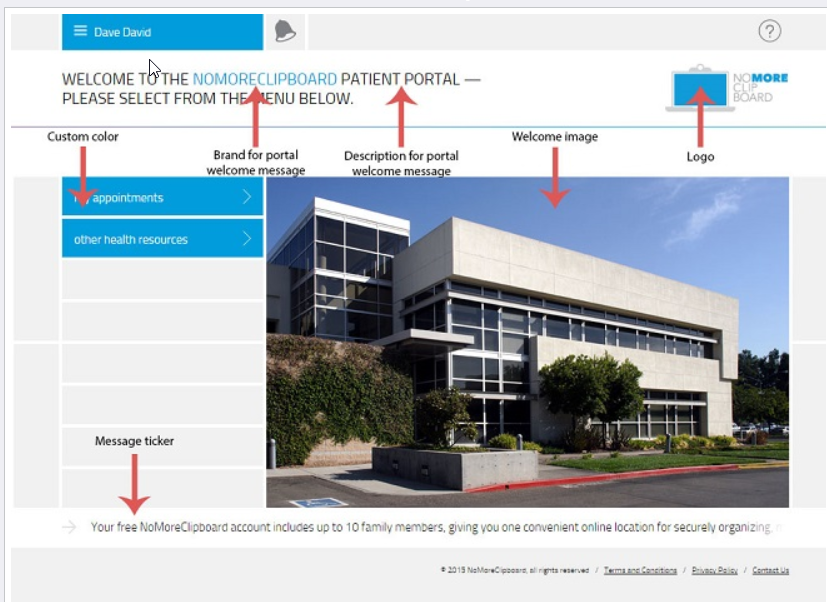 Brand for portal welcome message: The name or brand to be used in the Welcome Message. This field can be updated with up to 25 characters. By default, NoMoreClipboard will be displayed. Click Show Sample to see where this will display.