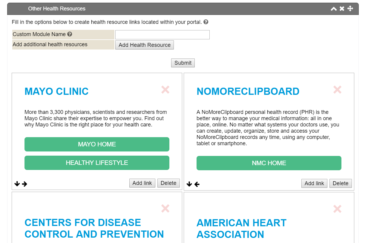 The Other Health Resources module allows for additional resources to be added to the portal, as needed. These resources can be internet or intranet resources, and there is no limit to the number of resources that can be added.