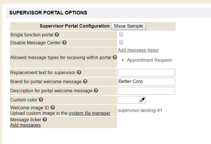 • Allowed message types for sending within portal: This field is to be used for establishing the message types allowed for transmission with the supervisor portal.
