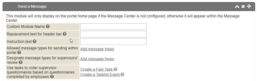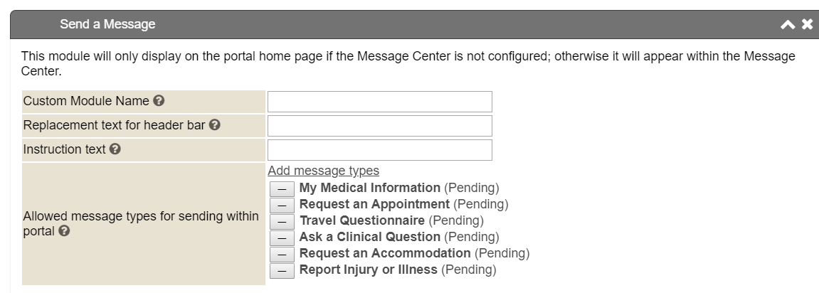 The Send a Message module can have its name and header customized, the sending instructions modified, or the message types configured, to determine what can/cannot be sent to and from the portal.