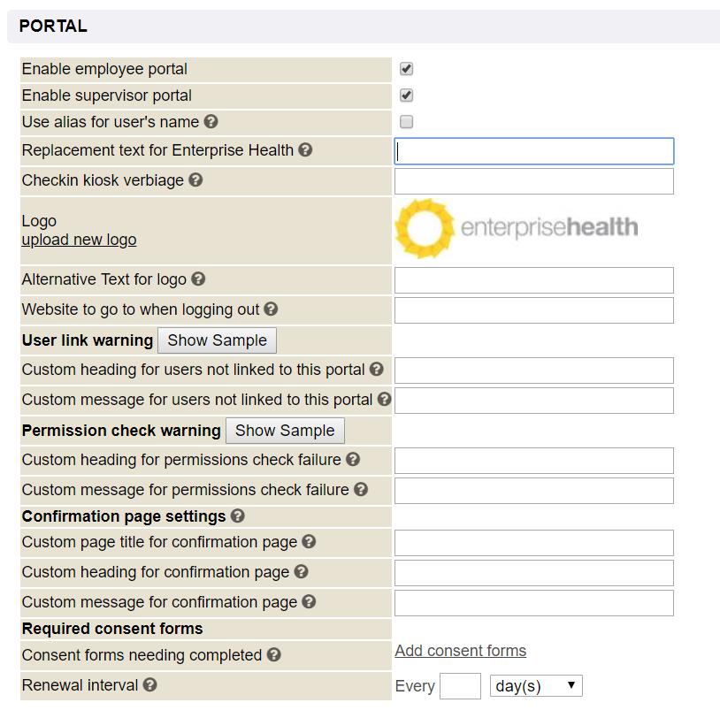 The Portal section, on the other hand, includes options to make label and verbiage changes, to update the logo, to disable either the employee or supervisor portal, and to add a consent form that would need to be electronically signed before being granted access to the portal.