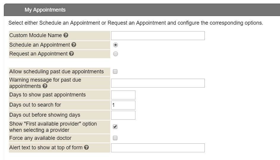 The My Appointments module can be updated to allow specific options for functionality, as well as for displaying warnings or specified text, as needed.
