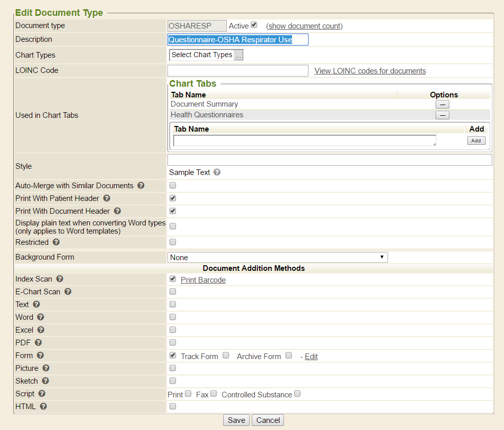 Document types are a foundational element of the Enterprise Health system. Document types establish the type of document, so that Enterprise Health understands what to do with the content, or data. Each document type gets mapped so that specific documents can display in one or more designated areas, or chart tabs. These are set up by default and should only be managed by the Deployment Consultant, from the Document Types tab of the Control Panel, if necessary.