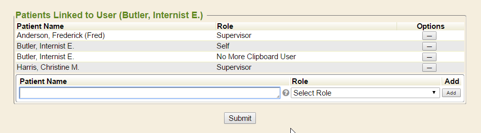The Patients Linked to User page will load. Begin typing the last name of the patient to be linked to the user, and select the name from the autocomplete. In order to gain access to the portal, the patient and user accounts require the role of No More Clipboard User. A supervisor should be linked with the Supervisor role.