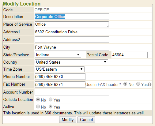 Adding and updating locations can be done using the Update Office Location section. Clients click the here link to edit the primary location of the business. Once this is updated, simply click the Modify button, and the page will refresh the Locations Manager, where additional locations can be added, as needed. This editor may also be accessed by navigating to the Control Panel and selecting the Locations Manager tab.
