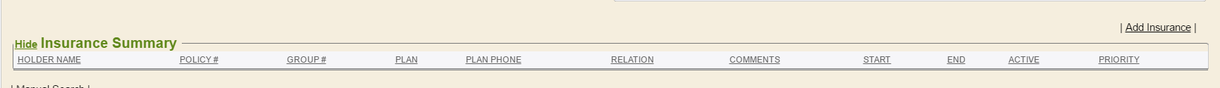 Adding and updating insurance to a chart is quick and easy with Enterprise Health . While in the individual’s chart, navigate to the Admin chart tab, and select Demographics from the menu. Scroll to the bottom of the page, to the Insurance Summary section. To begin entering insurance information, click the Add Insurance link. The page will refresh and display the Add Insurance Policy screen, where the insurance policy and pre-certification information may be added to the patient’s chart.