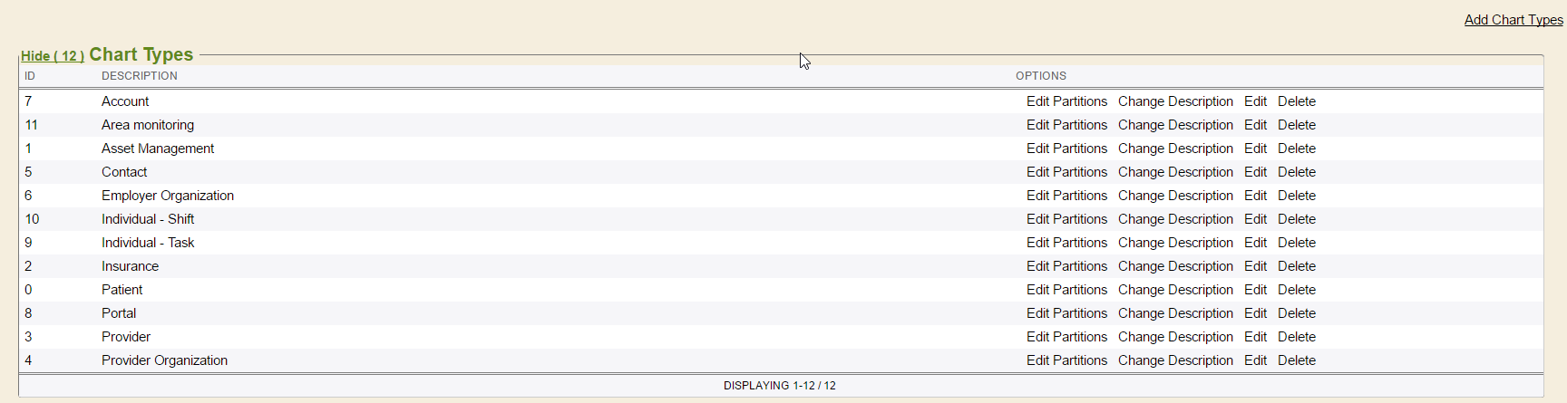 Chart Types are an important concept in Enterprise Health . Chart Types are used to differentiate between types of records in the system, allowing for different chart tabs, as needed. These should only be managed by a Deployment Consultant. To view chart types, navigate to the Chart Types tab in the Control Panel.