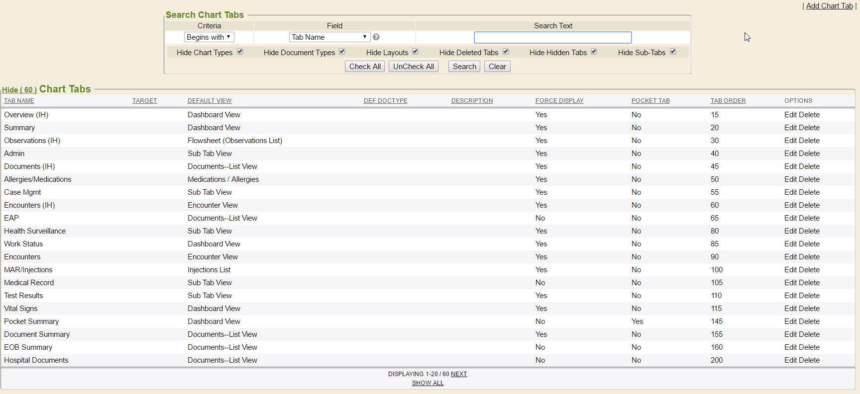 Chart tabs, too, are very important in the Enterprise Health system. Chart tabs hold the various contents of a chart type, or specific record. One aspect of chart tabs is to designate the types of documents to be available or used from a given chart tab. Though their color can be modified, and they can be added, removed, or renamed, as needed, they should only be managed by a Deployment Consultant. To view the default chart tabs, navigate to the Chart Tabs tab in the Control Panel.