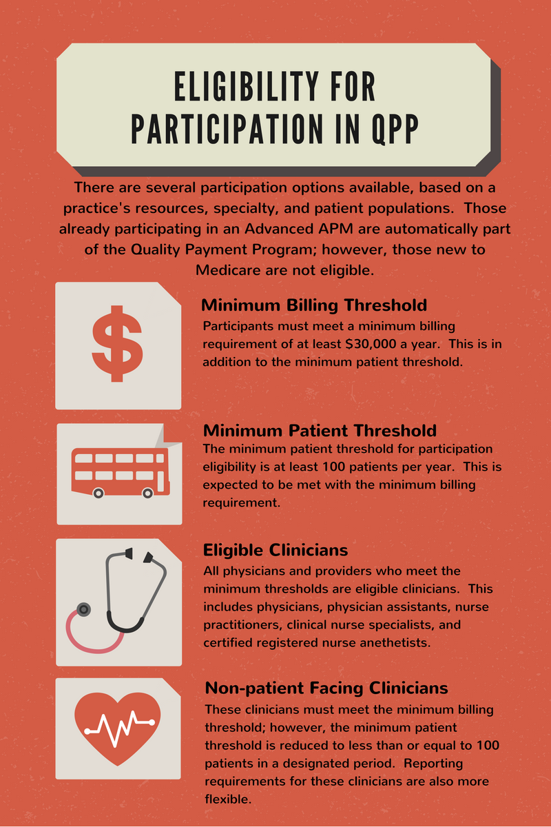 Depending on the direction of an entity, given its resources and patient population, qualification in the QPP may vary. Meet the various criteria for APM participants, to take part in Advanced APMs, or meet the Medicare Part B billing and patient thresholds, to participate in MIPS. For more information on eligibility for MIPS or APMs, visit CMS’ Innovation Center, Quality Payment Program site, or reach out to MIE.