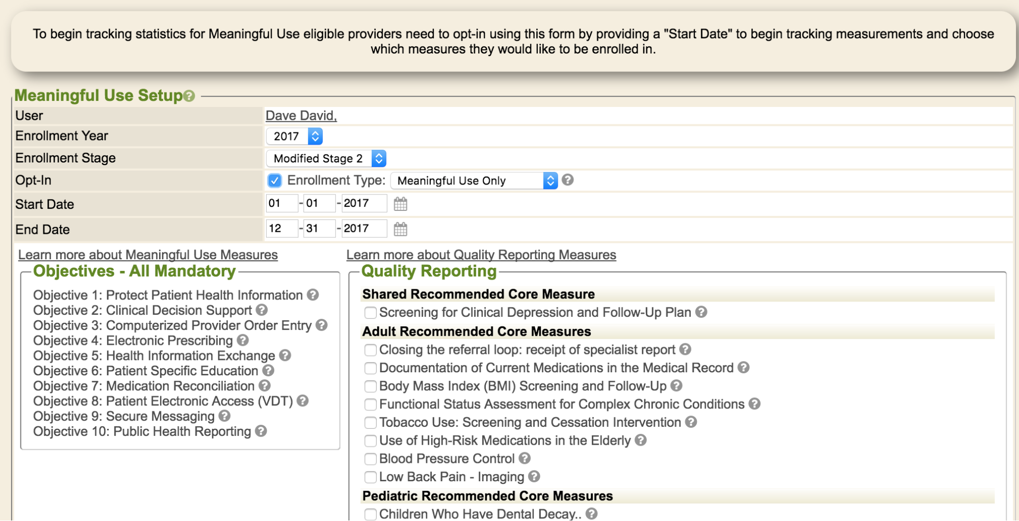 - Click Opt-in from within the Meaningful Use portlet.