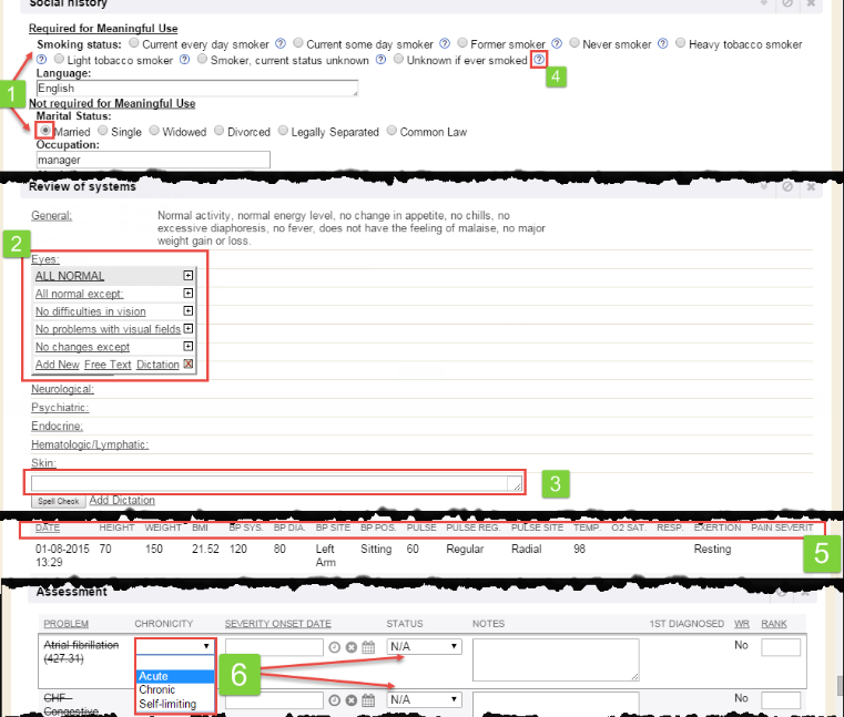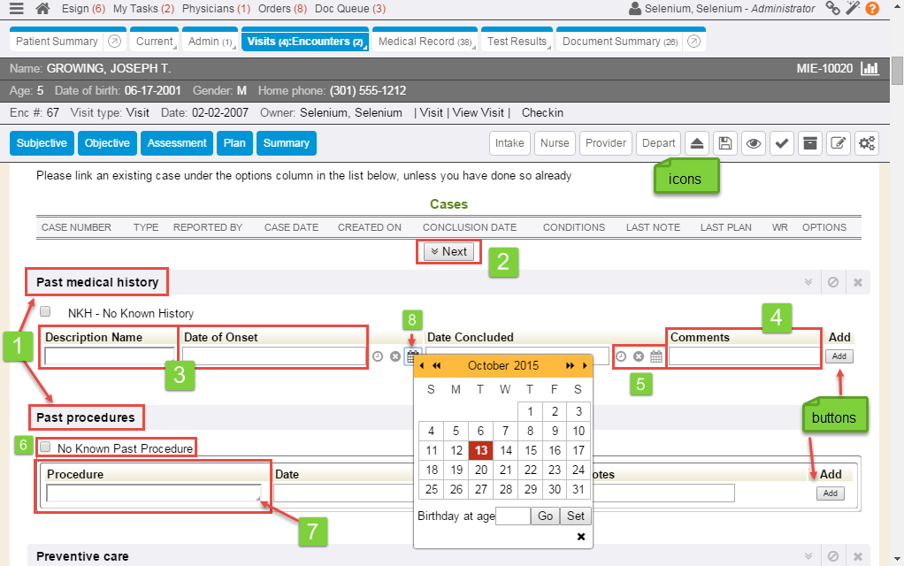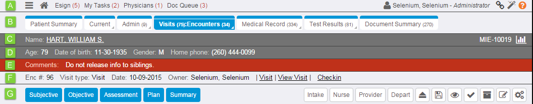 G. Encounter navigation toolbar: Displays navigation tabs to skip to different sections while working in an encounter. Hover over the tabs to display the sections that appear under each category.